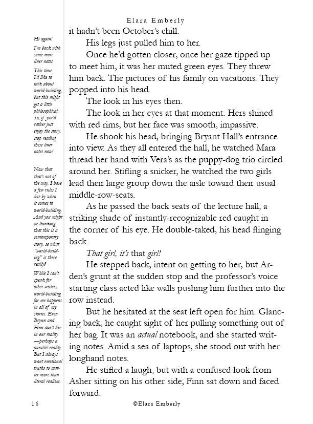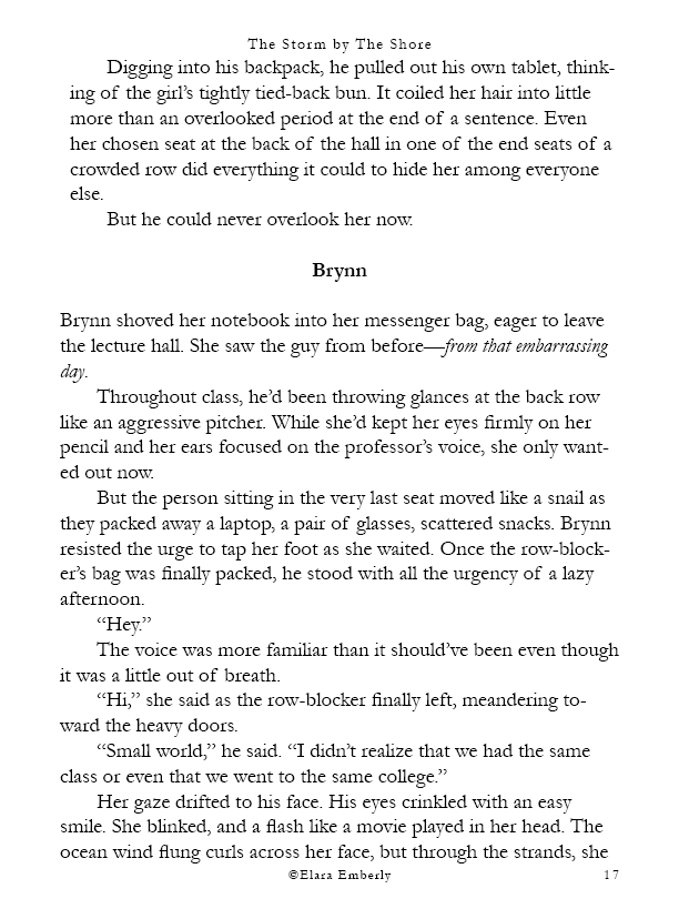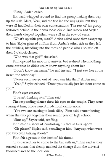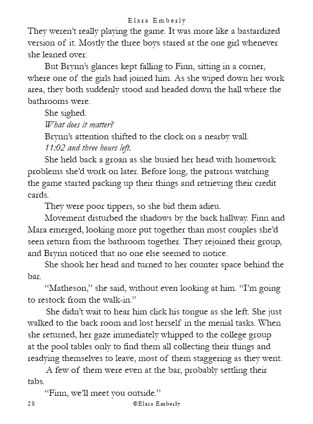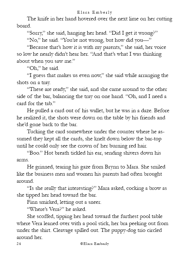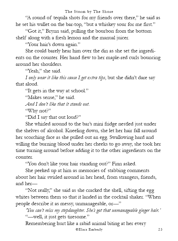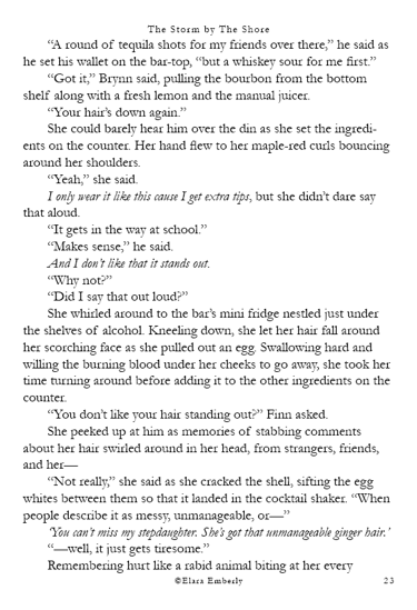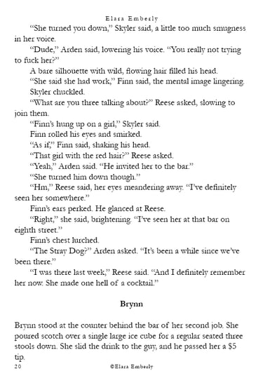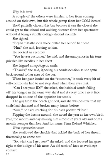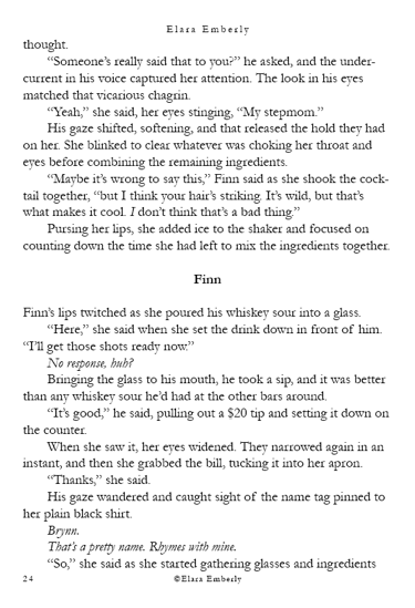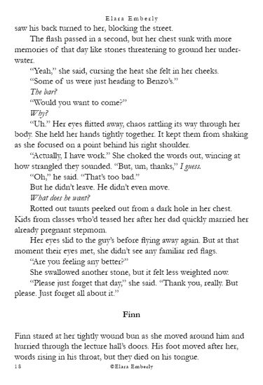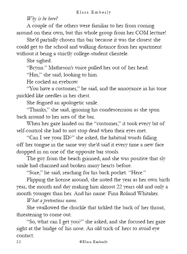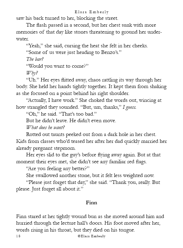 Finn can’t stop thinking about the red-haired girl from the shore. When he unexpectedly spots her in class, the memory refuses to fade. Brynn, meanwhile, wants nothing more than to disappear—but fate has other plans when he walks into the bar where she works. Their worlds start to overlap in ways neither expects, testing the fragile distance they both keep between honesty and self-protection. This chapter includes themes of emotional neglect, adult alcohol use, workplace tension, and suggestive situations.